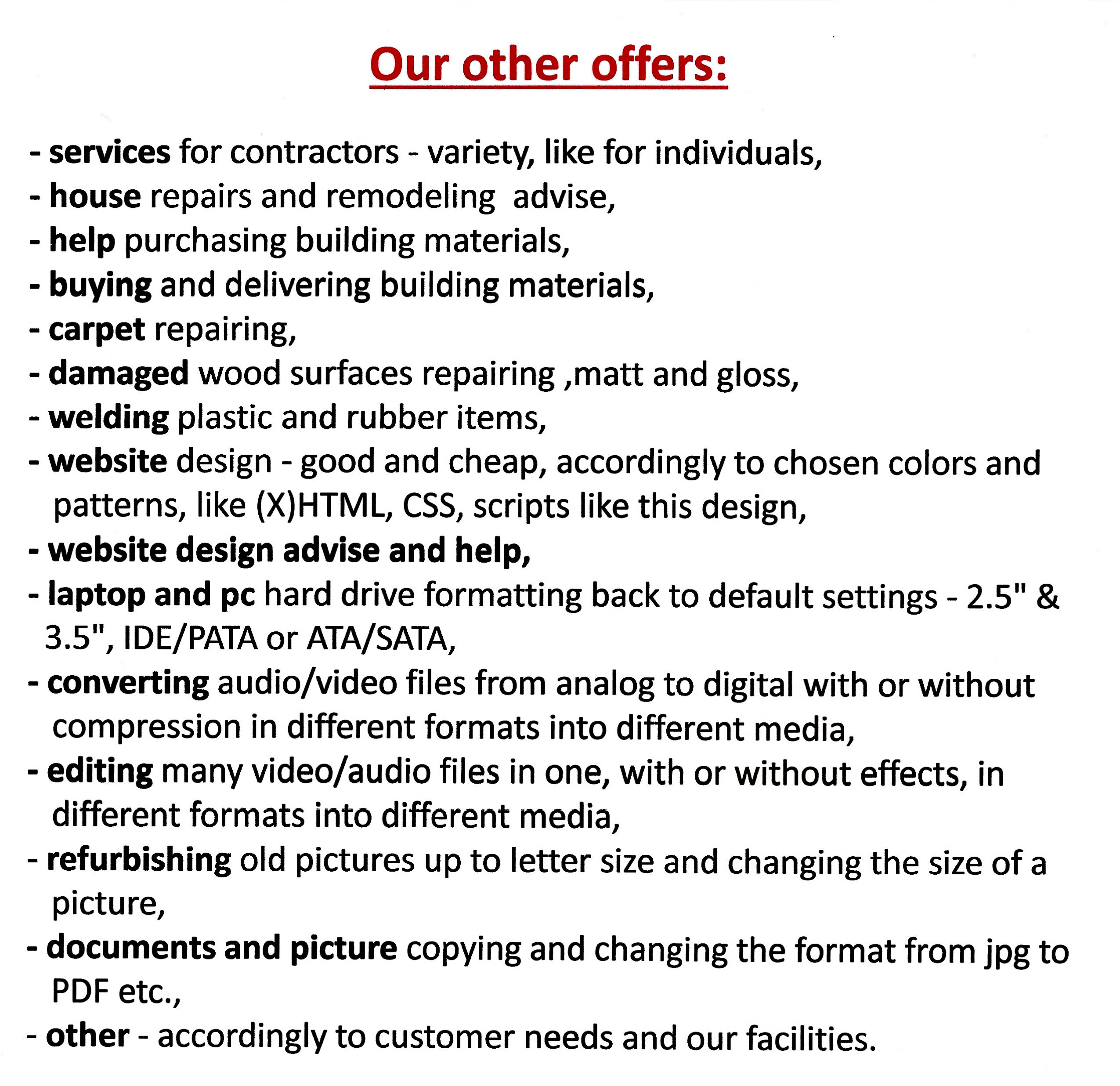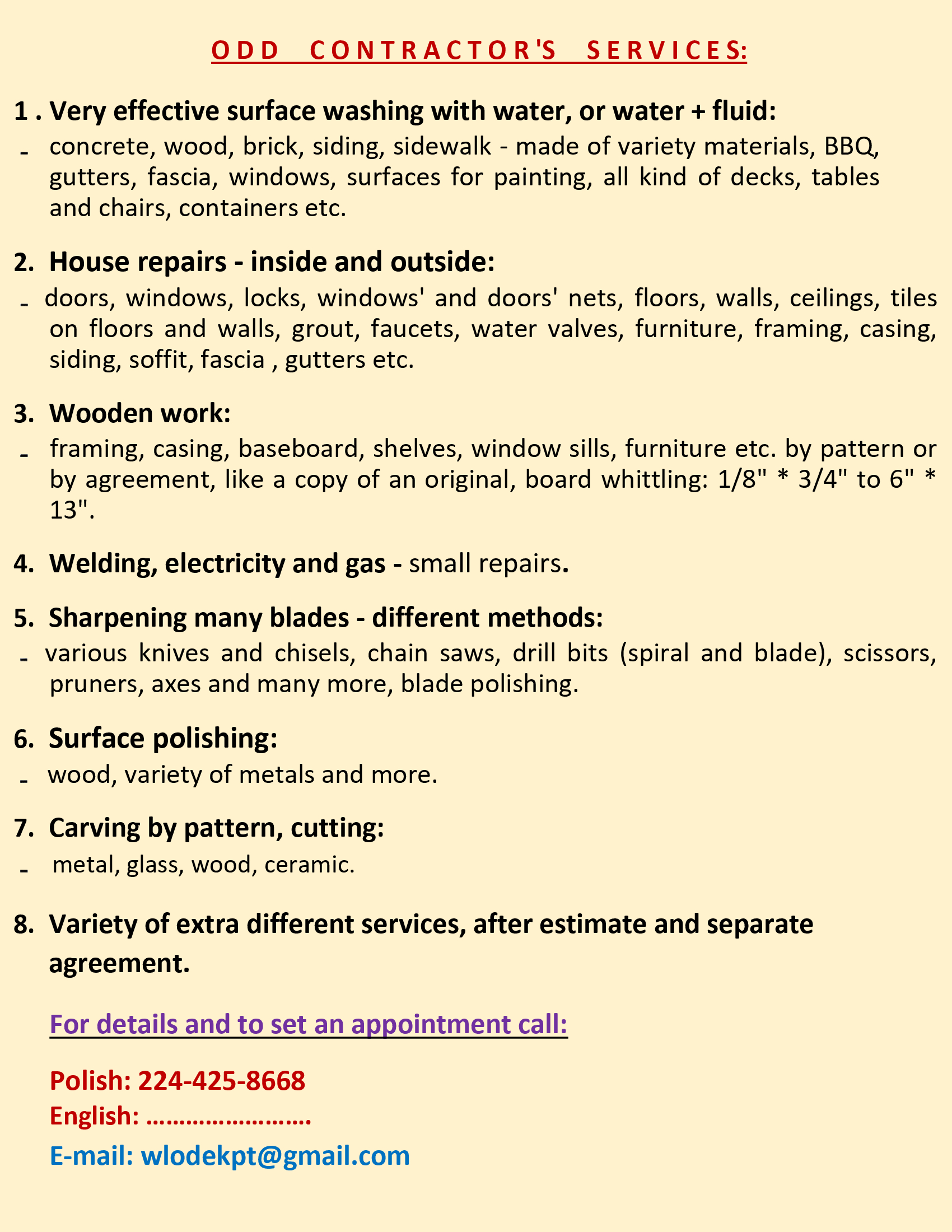 “ W E L C O M E - W I T A M Y ” - O F E R U J E M Y - NAPRAWY - DROBNE REMONTY - KONSERWACJE - MYCIE WODĄ POD CIŚNIENIEM - RENOWACJE - OBRÓBKĘ DREWNA - NAPRAWA WYKŁADZIN PODŁOGOWYCHi wiele więcej ... - “ W E L C O M E - Z A P R A S Z A M Y ”